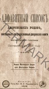 The full name is the «Alphabetical List of Noble Clans Included in the Pedigree of the Noble Books of the Mogilev Province» – the official printed publication of the Mogilev noble deputy assembly, which lists the noble names and persons with their titles, only the archive number from the noble fund and the number the order of each surname, and the part of the RDK into which they are entered.