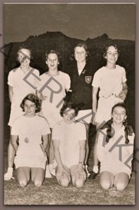 1951 May – Lindy with some of her classmates in a photo shoot. Lindy is standing 2nd to the right, and her long-time friend Libby Stokes is in the front, also 2nd from right. (Click to enlarge)