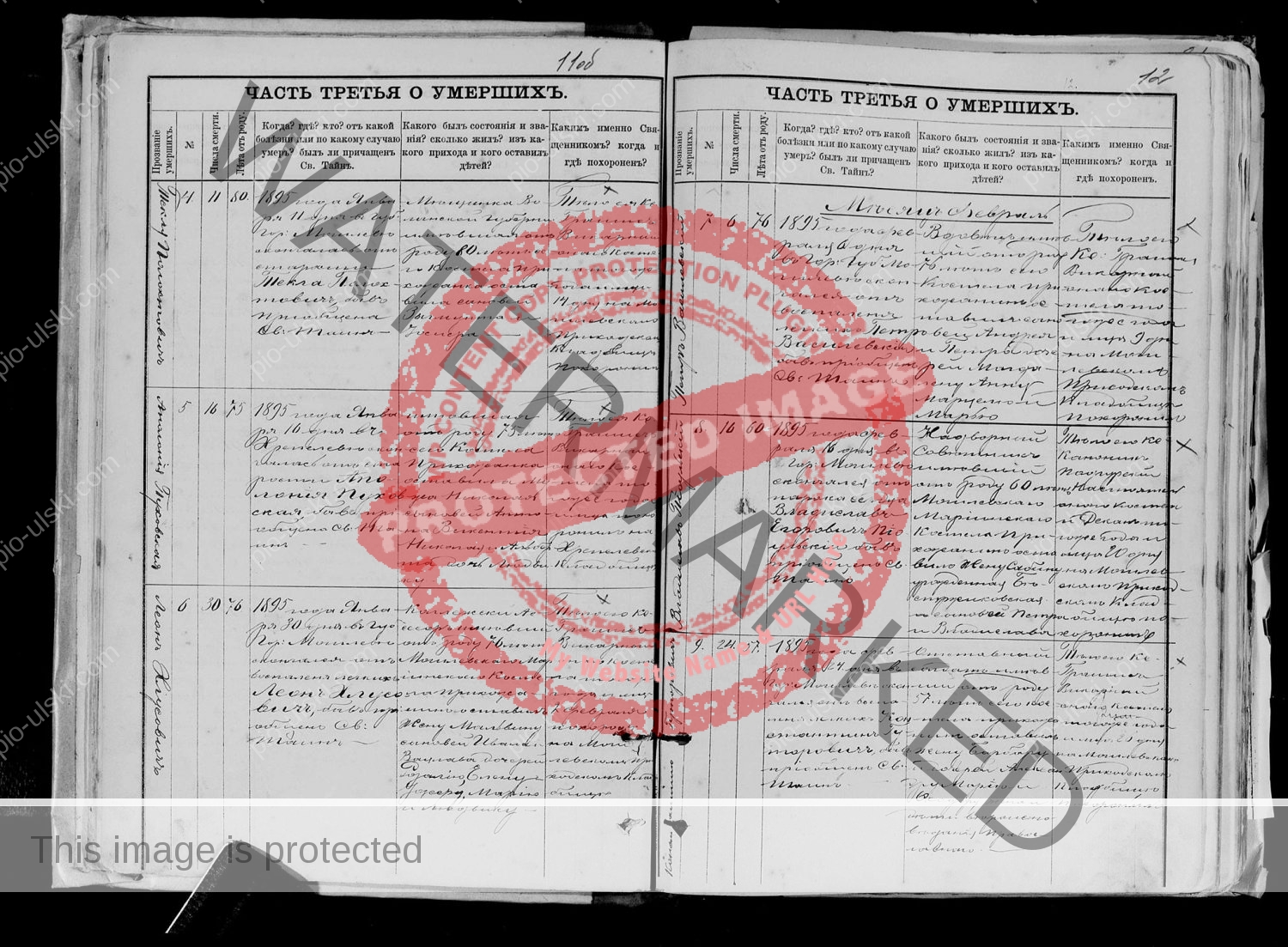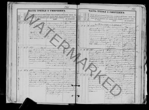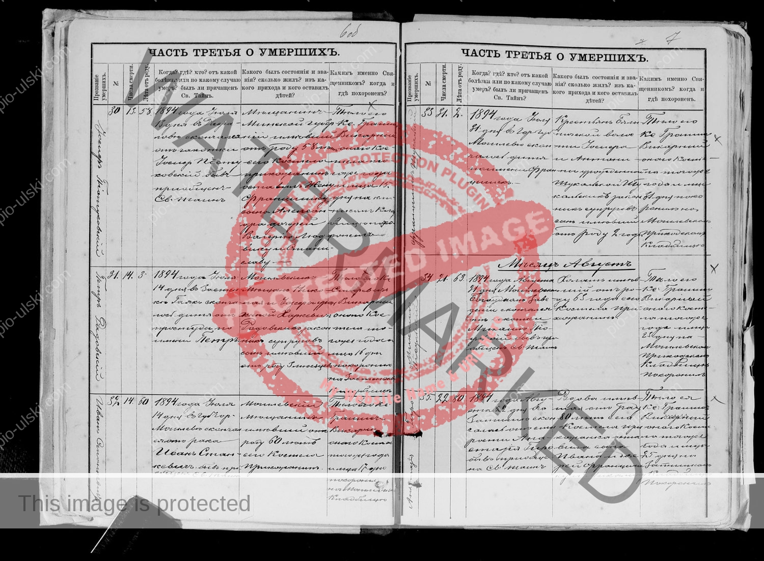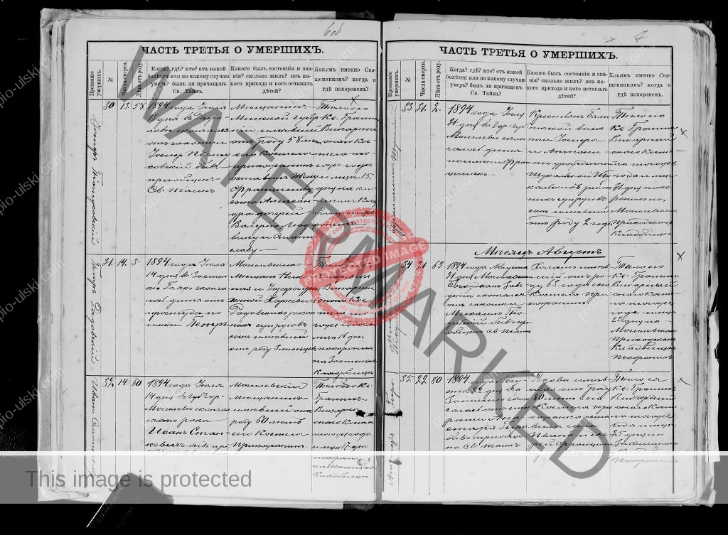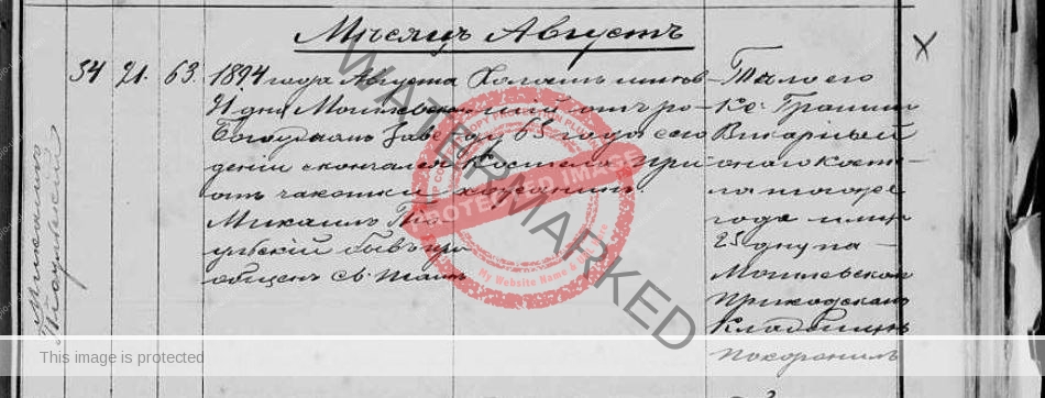 2) Death certificate of Michal (Michael) Pioulski who died on August 21, 1894. It’s the document nr 34. He was 63. He was buried on Aug 25, 1894 in Mogilev in a local cemetery.