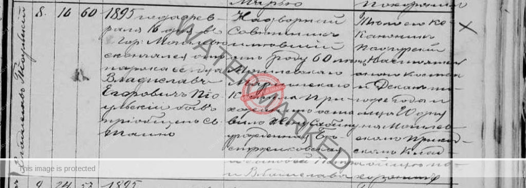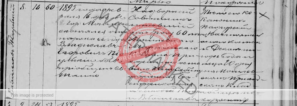 Death certificate of Vladyslav Egorovich Pioulski (Wladyslaw’s father, my great grandfather) who died on Feb 16, 1895, in Mogilev. He was 60 years old. His occupation was described as court counselor in the city of Mogilev. It’s the death certificate number 8 from year 1895.