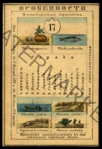This card is one of a souvenir set of 82 illustrated cards–one for each province of the Russian Empire as it existed in 1856. Each card presents an overview of a particular province’s culture, history, economy, and geography. The front of the card depicts such distinguishing features as rivers, mountains, major cities, and chief industries. The back of each card contains a map of the province, the provincial seal, information about the population, and a picture of the local costume of the inhabitants.
