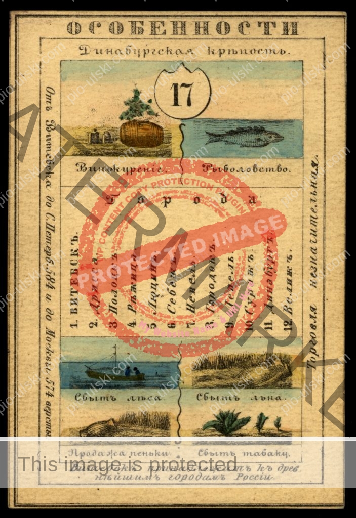 Витебская губерния Это открытка из сувенирного набора, состоящего из 82 иллюстрированных открыток, по одной на каждую провинцию Российской Империи в том виде, как она существовала в 1856 году. На каждой открытке представлен обзор культуры, истории, экономики и географии провинции. На лицевой стороне открытки описаны главные отличительные особенности провинции: реки, горы, крупные города и ключевые отрасли промышленности. На оборотной стороне каждой открытки изображены карта и печать провинции, приводится информация о населении, а также изображена традиционная одежда местных жителей. 1856