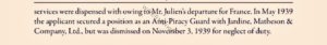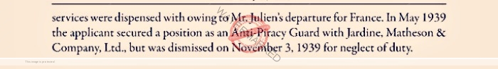 - 1939-1939 Anti-Piracy Guard with Jardine’s until his dismissal for neglect of duty