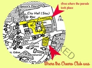 You can see the area where the parade took place and the small patch marked “Parade Ground” on this map is where the Cheero Club was. By 1963 the Hilton Hotel was built there!