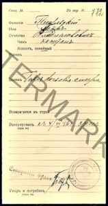 - WWII participant. In the hospital in Odessa 07/04/1916, arrived from the station. Fire victims. Captain on 07/14/1916 – 107th Trinity Infantry Regiment