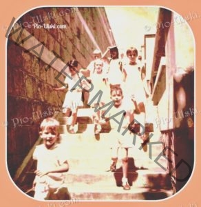 The popsie man with a schoolgirl customer 😉 (Click to enlarge) **…the stairs are forever etched in my memory, as is the memory of the popsie man at the bottom of them!